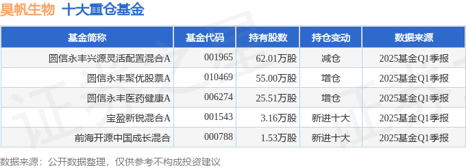 持有昊帆生物最多的基金为圆信永丰兴源灵活配置混合A,目前规模为2.24亿元,最新净值1.8342(4月28日),较上一交易日下跌0.75%,近一年上涨21.45%。该基金现任基金经理为肖世源。